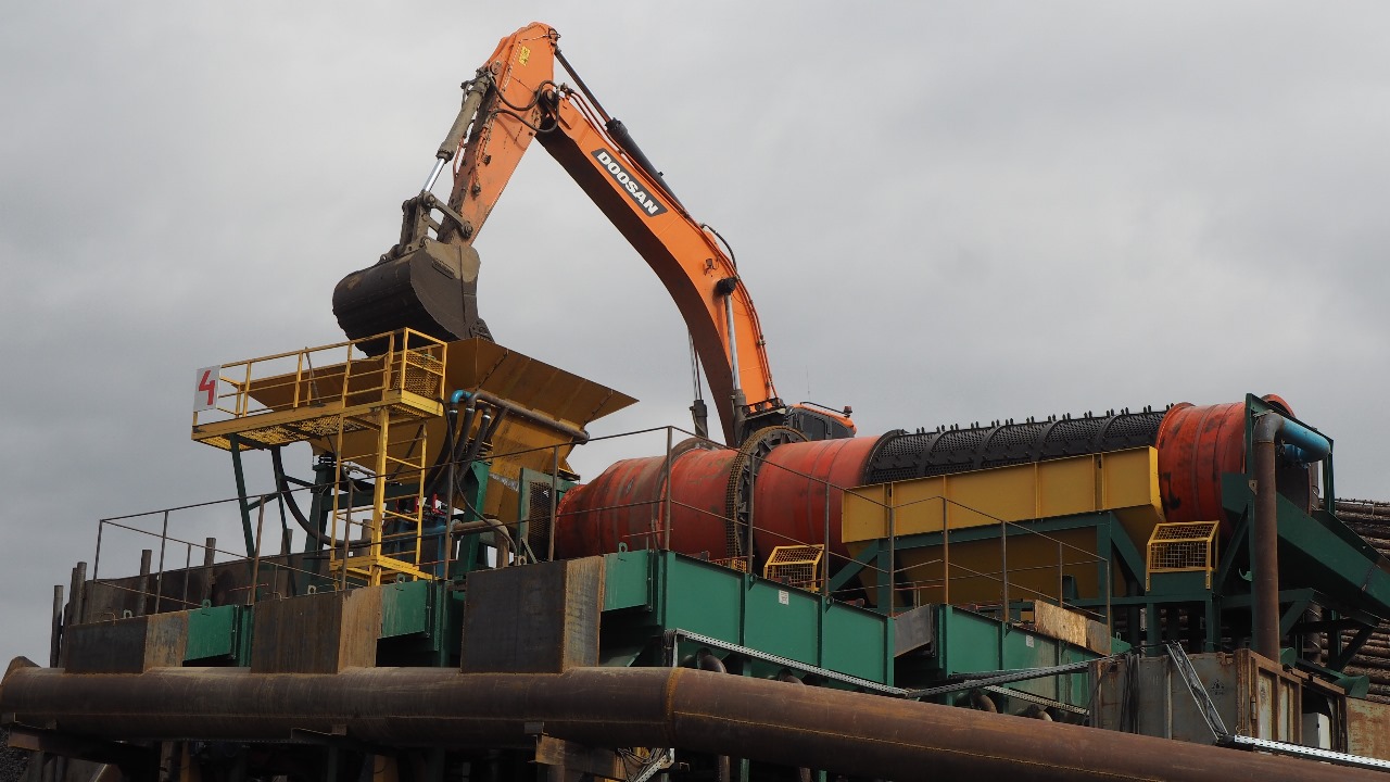 Что же касается обогащения, то здесь всё проходит по стандартному в таких случаях гравитационному методу. Сначала порода поступает во вращающуюся горизонтальную бочку — скруббер-бутару производительностью 150 кубометров в час. В первой её части — скруббере — материал под действием центробежной силы и силы тяжести, встроенных лопаток и воды разрыхляется, глина размывается. Во второй — бутаре — через сита происходит разделение на фракции: частицы более 30 миллиметров отправляют в отвал, менее 30 миллиметров — для дальнейшего обогащения. На стоящих вслед за скруббер-бутарой модах (машинах отсадочных диафрагмовых) им устраивают «встряску» в воде. Тяжёлые частицы оседают на решете, на дне, лёгкие уходят с потоком воды.
